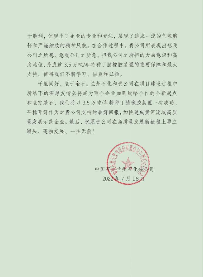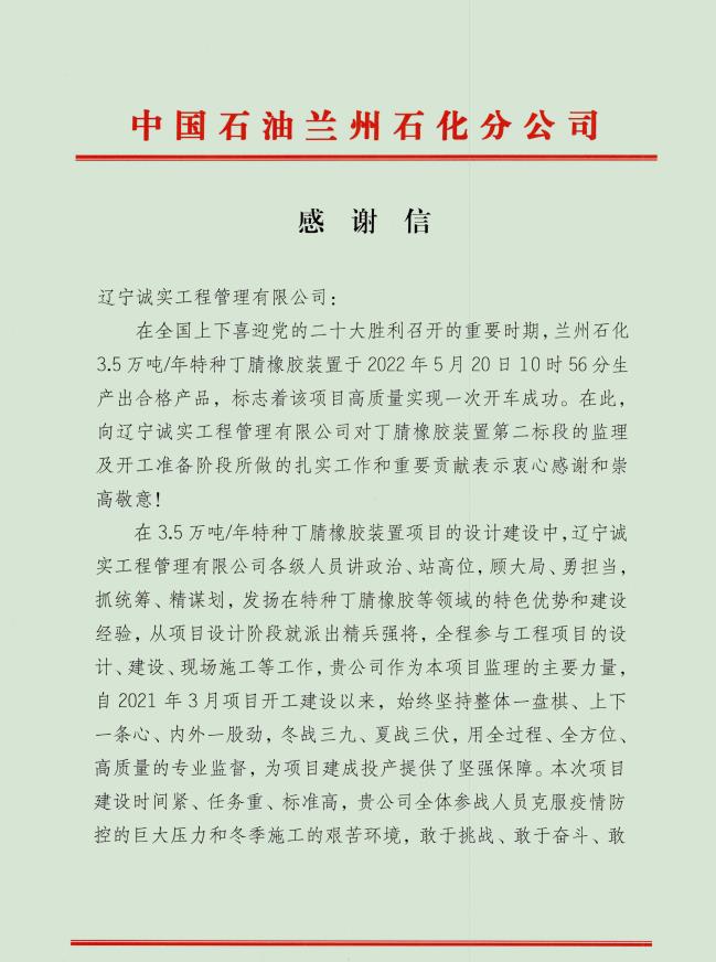 近日,由我公司監(jiān)理的中國石油天然氣股份有限公司蘭州石化分公司--3.5萬砘/年特種丁腈橡膠項目喜獲業(yè)主表揚信。表揚信充分肯定了誠實監(jiān)理的工作成果,對駐蘭州項目部全體監(jiān)理工程師在項目建設(shè)過程中所付出的努力表示由衷的感謝。