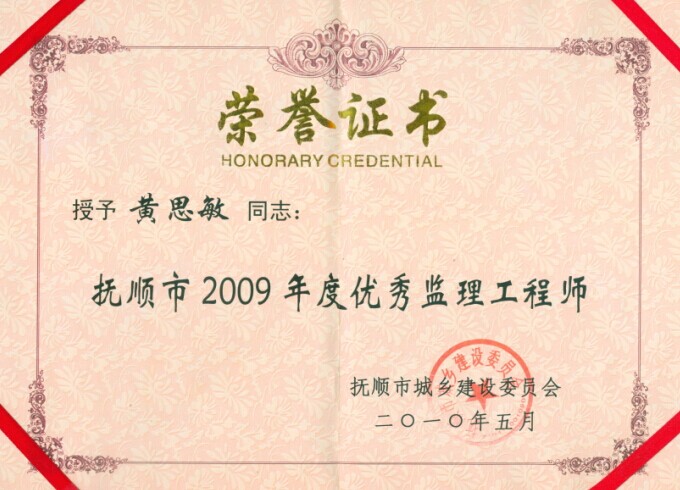 黃思敏同志被評為撫順市年度優(yōu)秀監(jiān)理工程師