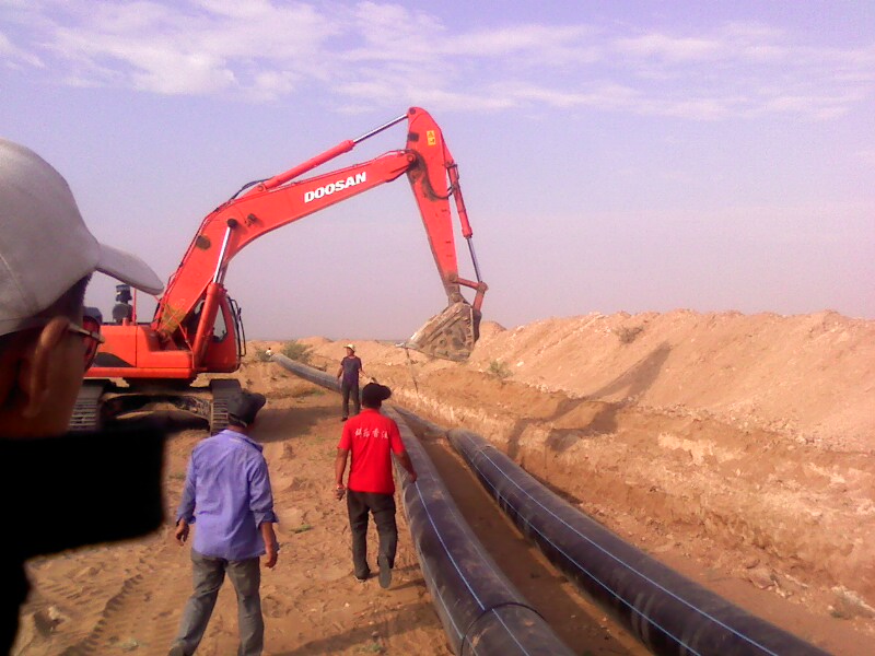 巴二建在主管線敷設(shè)已熔接好的DN500PE管