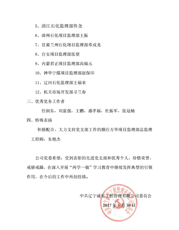 為慶祝中國共產(chǎn)黨建黨96周年,公司黨委于2017年6月30日下午在公司一樓會議室召開了慶祝建黨96周年暨“一優(yōu)兩先”表彰視頻大會。公司機關(guān)、撫順各項目監(jiān)理部及在撫的黨員同志在主會場參加了大會,中海油惠州項目監(jiān)理部黨支部、甘肅華亭項目監(jiān)理部黨支部、寧夏石化項目監(jiān)理部黨支部、中化泉州項目監(jiān)理部黨支部、廣西石化項目監(jiān)理部黨支部、蘭州石化項目監(jiān)理部黨支部、內(nèi)蒙古君正項目監(jiān)理部黨支部、神華寧煤項目監(jiān)理部黨支部、煙臺萬華項目監(jiān)理部黨支部設(shè)立視頻分會場。黨委委員馬駿主持了視頻大會。首先,公司黨委副書記馮玉琢同志宣讀了“一優(yōu)兩先”表彰決定。接著,黨委書記孫學(xué)良結(jié)合公司實際做了慶祝建黨96周年的講話。最后全體黨員重溫的入黨誓詞,進行入黨宣誓。