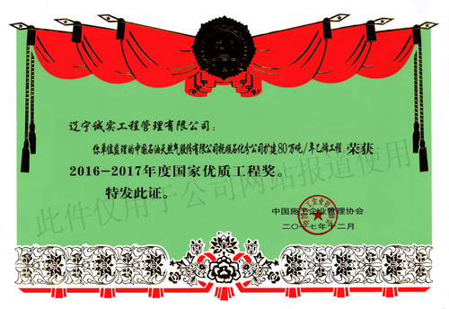 2017年11月10日,根據(jù)中施企協(xié)字【2017】66號文件——《關(guān)于表彰2016-2017年度國家優(yōu)質(zhì)工程獎的決定》公告,我單位所監(jiān)理的“中國石油天然氣股份有限公司撫順石化分公司擴(kuò)建80萬噸/年乙烯工程”榮獲2016-2017年度國家優(yōu)質(zhì)工程獎,該項(xiàng)目總監(jiān)“任潤東”還獲得了“2016-2017年度第二批國家優(yōu)質(zhì)工程獎突出貢獻(xiàn)者”的榮譽(yù)稱號。