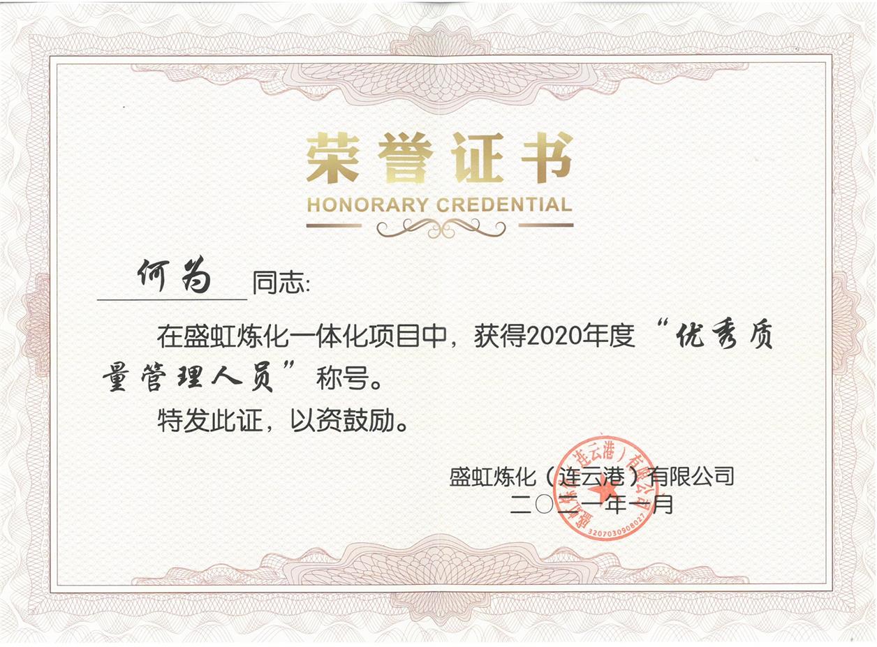 熱烈祝賀何為同志榮獲盛虹煉化一體化項目2020年度“優(yōu)質質量管理人員”榮譽稱號
