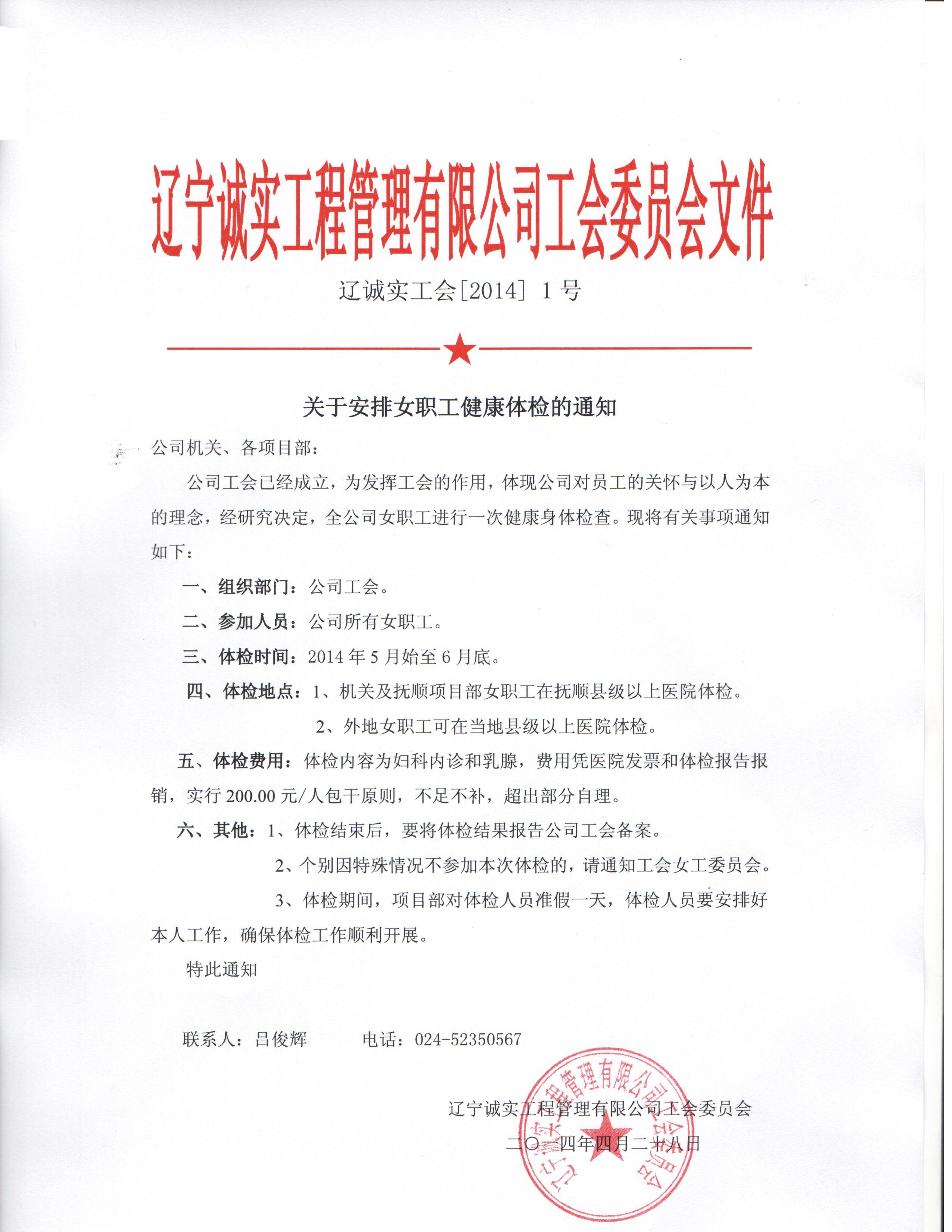 誠實工會將組織全體女職工于2014年5月底至6月底期間進行健康體檢